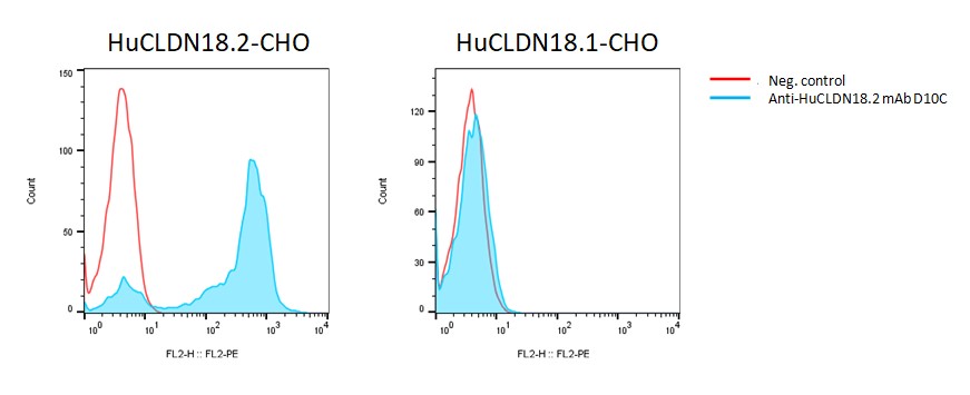 | Specificity Analysis | Anti-huCLDN18.2 mAb, clone D10C (Cat. #A1008-200), at 20 ug/mL was incubated with human CLDN18.2-CHO cells (Cat. #C1001) and human CLDN18.1-CHO cells (Cat. #C1017), followed by staining with PE-anti human IgG secondary antibody |