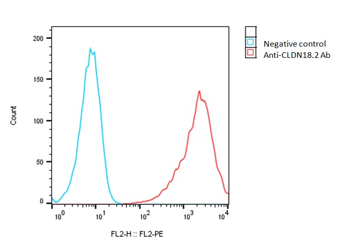 Claudin-18 (CLDN18) is a member of a large family of four-span transmembrane proteins called Claudins. These proteins are the essential components of the mammalian tight junctions (TJs) in epithelial cells. Claudin-18 has two splice variants, 18.1 and 18.2. While CLDN18.1 is specifically expressed in the lung tissue, CLDN18.2 expression in normal tissue is more restricted and is only detected in small patches of stomach mucosal. CLDN18.2 expression is elevated in many types of epithelial cancers including stomach, esophagus, pancreatic and ovarian cancers. The expression of CLDN18.2 is not only detected in primary tumors, but also in the metastatic sites. Therefore, CLDN18.2 is an ideal target for monoclonal antibody-based cancer therapies.
