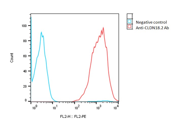 Claudin-18 (CLDN18) is a member of a large family of four-span transmembrane proteins called Claudins. These proteins are the essential components of the mammalian tight junctions (TJs) in epithelial cells. Claudin-18 has two splice variants, 18.1 and 18.2. While CLDN18.1 is specifically expressed in the lung tissue, CLDN18.2 expression in normal tissue is more restricted and is only detected in small patches of stomach mucosal. CLDN18.2 expression is elevated in many types of epithelial cancers including stomach, esophagus, pancreatic and ovarian cancers. The expression of CLDN18.2 is not only detected in primary tumors, but also in the metastatic sites. Therefore, CLDN18.2 is an ideal target for monoclonal antibody-based cancer therapies.