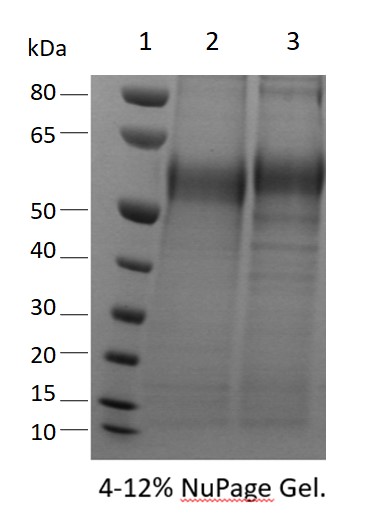 10 µg/lane of human DDR1 His tagged protein was resolved on SDS-PAGE gel in non-reducing (lane 2) and reducing (lane 3) conditions and visualized by CoomassieBlue staining.