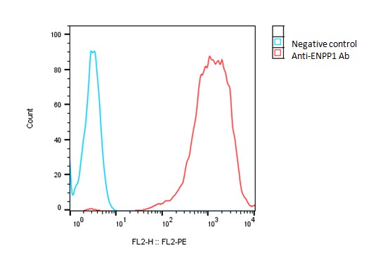 Detection of human ENPP1 expression on human ENPP1-CHO-S stable cells using a monoclonal antibody specific for human ENPP1 (Accurus #A1022)