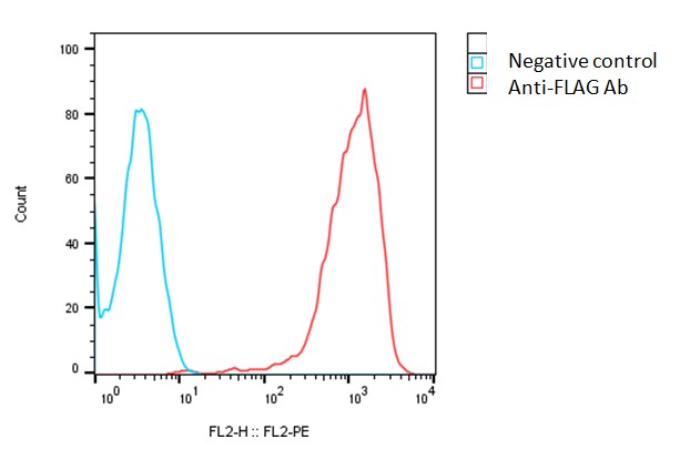 Detection of human TMIGD2 expression on human TMIGD2-CHO-K1 stable cells using an anti-FLAG tag antibody (Accurus, #A1001), followed by staining with PE-anti mouse antibody.
