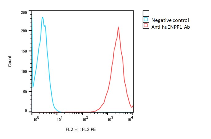 Detection of human ENPP1 expression on human ENPP1-CHO-K1 stable cells using a monoclonal antibody specific for human ENPP1 (Accurus Cat. #A1022), followed by staining with PE anti-human IgG antibody.