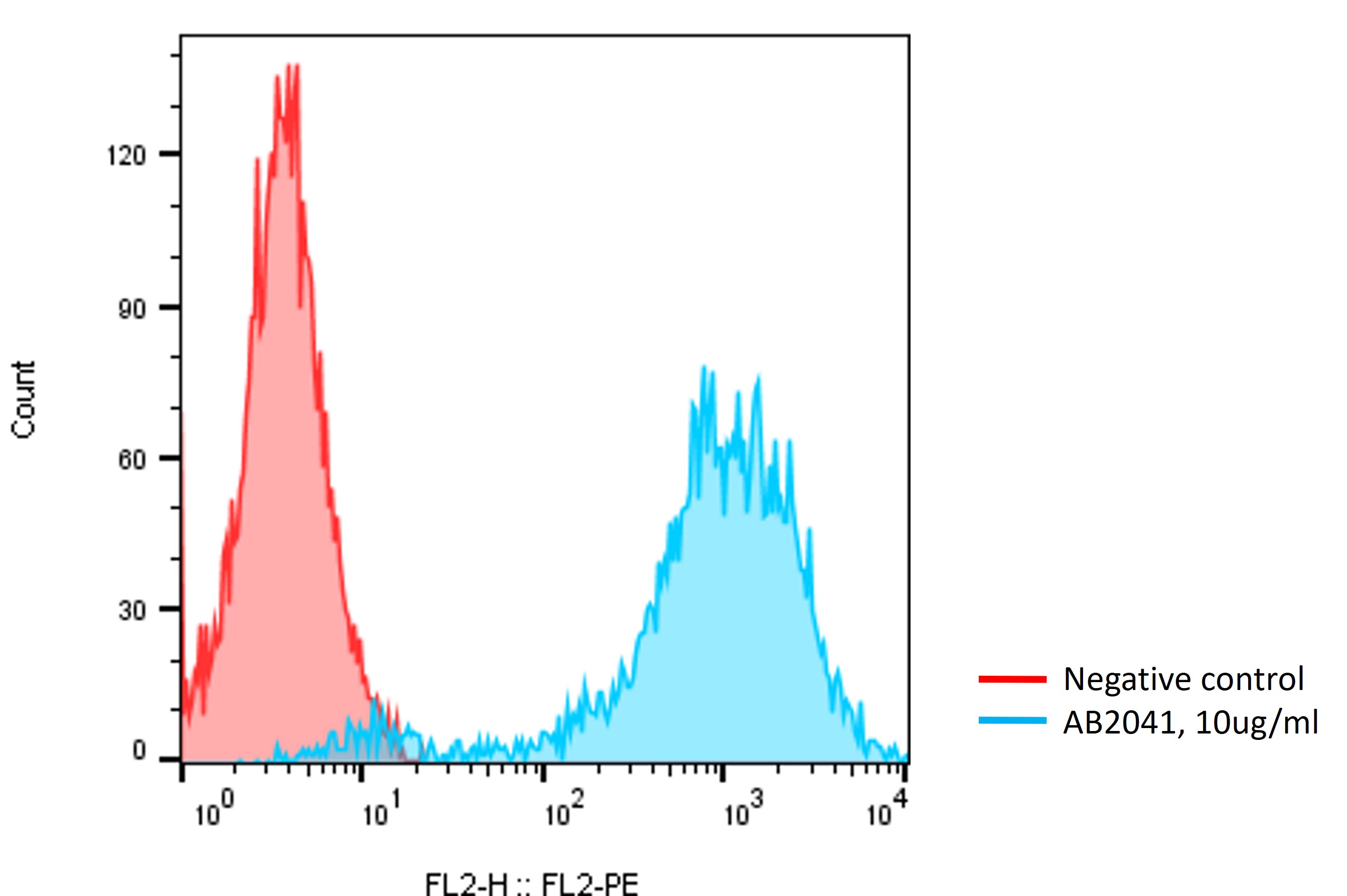 Detection of human DDR1 on Human DDR1-CHO-K1 cells (Cat. #C3030) by flow cytometry. Anti-human DDR1 antibody AB2041 was incubated with human DDR1-CHO-K1 cells (Cat. #C3030), followed by staining with PE-anti-mouse IgG.