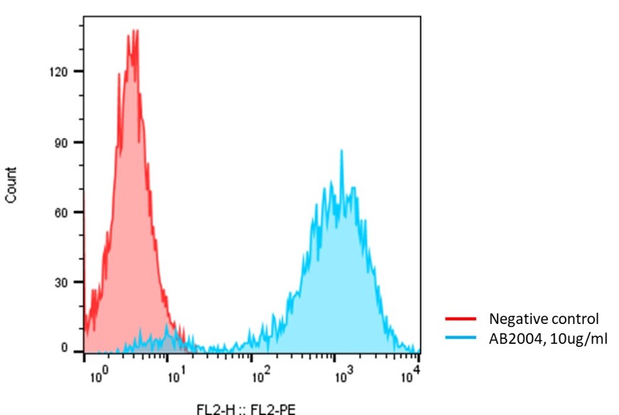 Detection of human DDR1 on Human DDR1-CHO-K1 cells (Cat. #C3030) by flow cytometry. Anti-human DDR1 antibody AB2004 was incubated with human DDR1-CHO-K1 cells (Cat. #C3030), followed by staining with PE-anti-mouse IgG.