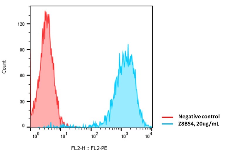 Detection of human DDR1 on Human DDR1-CHO-K1 cells (Cat.#C3030) by flow cytometry. Anti-human DDR1 antibody Z8BS4 (Cat.#A1029) was incubated with human DDR1-CHO-K1 cells (Cat.#C3030), followed by staining with PE-anti-mouse IgG.