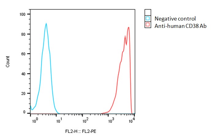 CD38, also known as cyclic ADP ribose hydrolase, is a transmembrane glycoprotein and an ectoenzyme belonging to the family of NAD(+) glycohydrolases. CD38 plays a crucial role in various cellular processes, including calcium signaling, cell adhesion, and modulation of immune responses. Its primary enzymatic activity involves the conversion of NAD(+) to cyclic ADP-ribose (cADPR), leading to the regulation of intracellular calcium levels and subsequent downstream signaling pathways. CD38 is widely expressed in various tissues throughout the human body, particularly in hematopoietic cells, including lymphocytes, monocytes, and dendritic cells. Additionally, CD38 expression has been observed in non-hematopoietic tissues such as the brain, kidney, and gastrointestinal tract. Alterations in CD38 expression have been implicated in several types of hematological malignancies, such as multiple myeloma, chronic lymphocytic leukemia, and acute lymphoblastic leukemia where CD38 is overexpressed and associated with disease progression and poor prognosis. Moreover, CD38 expression has been reported in solid tumors, including breast cancer, ovarian cancer, and prostate cancer, where it contributes to tumor growth, metastasis, and resistance to therapy. CD38 has emerged as a promising therapeutic target for cancer treatment. Monoclonal antibodies targeting CD38 exert their anti-tumor effects through various mechanisms, including antibody-dependent cellular cytotoxicity (ADCC), complement-dependent cytotoxicity (CDC), and direct inhibition of CD38 enzymatic activity. Additionally, small-molecule inhibitors of CD38 are being investigated as potential therapeutic agents for cancer and other diseases.