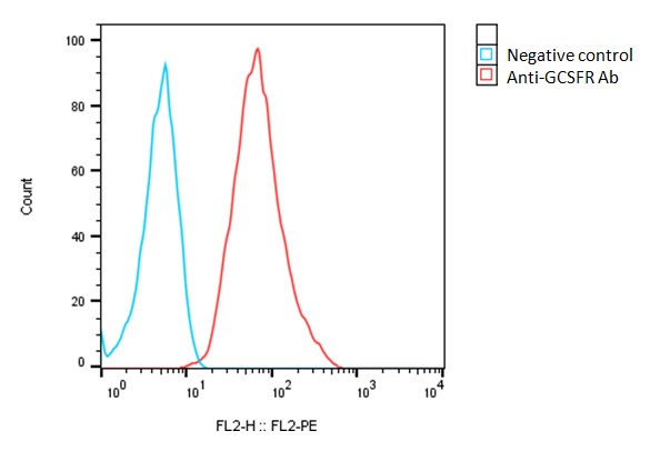 Detection of human GCSFR expression on human GCSFR-Ba/F3 stable cells using a monoclonal antibody specific for human GCSFR (BD Pharmingen Cat#554538)