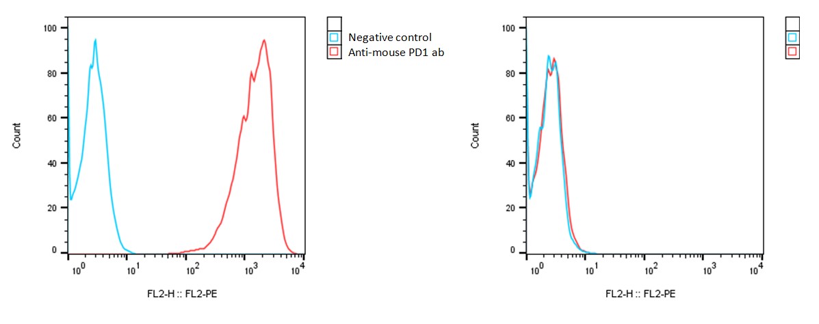 Detection of mouse PD-1 expression on mouse PD-1-CHO-K1 stable cells (A) and Vector Control-CHO-K1 (B) using a monoclonal antibody specific for mouse PD-1 (eBioscience #12-9985-81)