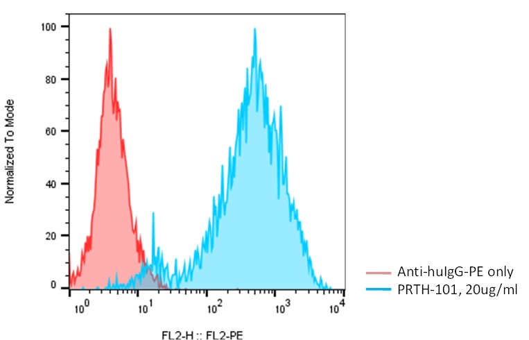 Detection of human DDR1 on DDR1-CHO-K1 cells (Cat. #C3030) by flow cytometry. Anti-human DDR1 antibody PRTH-101 (Cat. #A1039) was incubated with human DDR1-CHO-K1 cells (Cat. #C3030), followed by staining with PE-anti-human IgG.