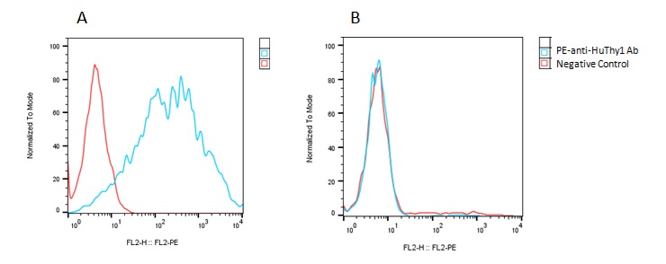 Detection of human Thy expression on human Thy1-CHO-K1 stable cells (A) and CHO-K1 stable cells (B) using PE-anti-human-Thy1 Ab (Cat. #12-0909-41).