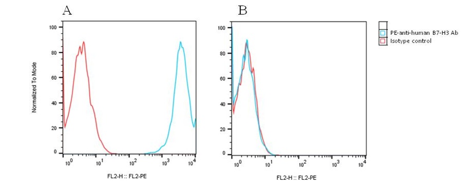 Detection of cyno B7-H3 expression on cyno B7-H3 (4Ig)-CHO-K1 stable cells using a PE-anti-human B7-H3 antibody (BioLegend, #351004).
