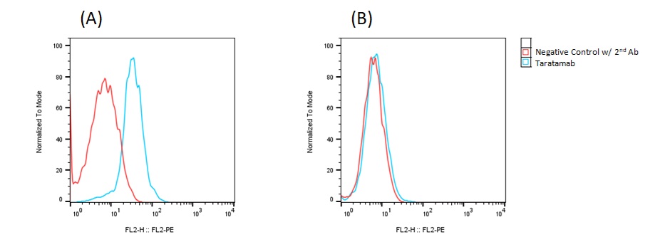 Detection of Human DLL3 expression on Human DLL3-CHO-K1 stable cells (A) and Vector Control CHO-K1 stable cells (B) using anti-human-DLL3 antibody (Taratamab), followed by staining with PE-anti-Human IgG antibody.