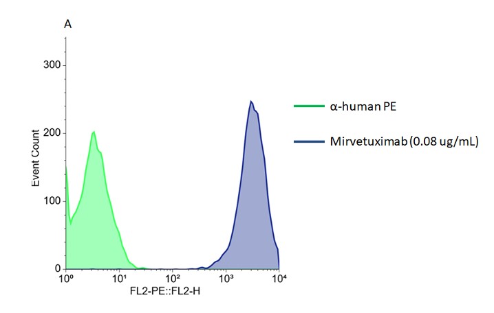 Detection of human FOLR1 expression on Human FOLR1-CHO-K1 cells (Cat. #C3038) by flow cytometry. Anti-human FOLR1 antibody Mirvetuximab (Cat. #A1040) was incubated with human FOLR1-CHO-K1 cells(Cat. #C3038), followed by staining with PE-anti-human IgG.