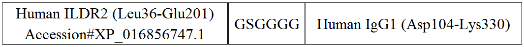 | Source: | Human ILDR2 (Accession # XP_016856747.1) extracellular domain (Leu36-Glu201) fused with human IgG1 Fc produced from HEK293 cells.