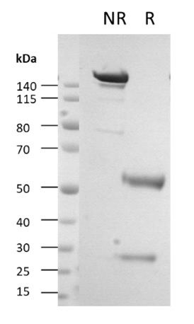 A: Human IgG4 isotype control (5µg/lane) was resolved on SDS-PAGE gel in non-reducing (NR) and reducing (R) conditions and visualized by Coomassie blue staining.