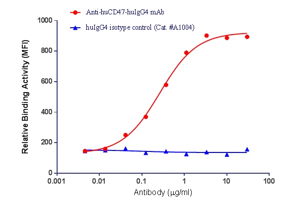 C: Anti-human CD47-huIgG4 mAb and human IgG4 isotype control (Cat. #A1004) were tested for binding to CD47-expressing cells by flow cytometry. Cells were stained with PE-anti-human IgG secondary antibody.
